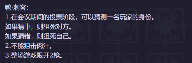 6.小红一开局就报了自己是肉汁。刺客不能狙肉汁,所以肉汁不必像其他职业一样,对公开身份抱有顾虑,反而是越早报身份,找到好鹅抱团,以防单走被杀越好。