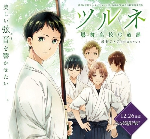 《弦音 风舞高中弓道部》在 2016 年第 7 回京都动画大奖小说部门中获得了评审特别奖,这部作品和 Free! 一样讲述了一群高中男生在体育系社团的故事。所谓弦音指的是,弓箭射出时弓弦发出的声音,弦音很容易受天气还有选手的心理状态影响,即便是同一个选手使用同一张弓,也会发出不同的弦音。发出融合着真善美的弦音也是射手所追求的目标。小说的男主角鸣宫凑,初中的时候隶属于弓道部而且还被作为学校代表队的一员参加县大会。但由于自身的某个原因在县大会的决赛上队伍输掉了比赛。从这之后凑就逃避自己喜欢的弓道,进入了老家的风舞高中。