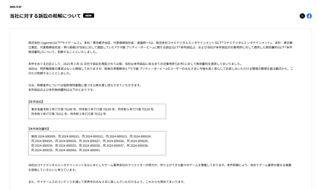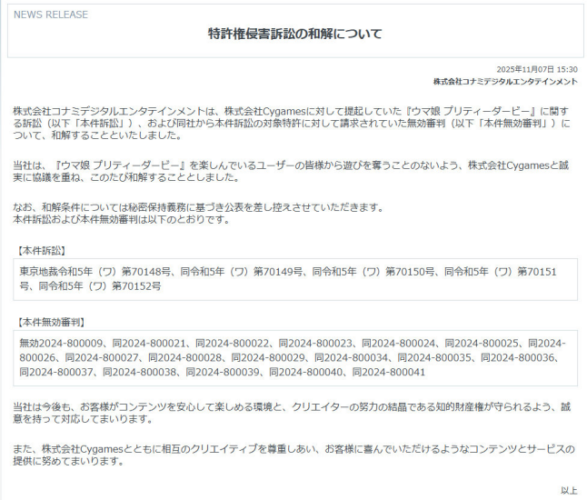 [新闻] [11.15][转载新闻]索赔40亿日元!《赛马娘》专利诉讼落幕,科乐美与Cygames和解 |