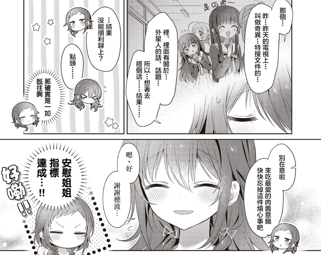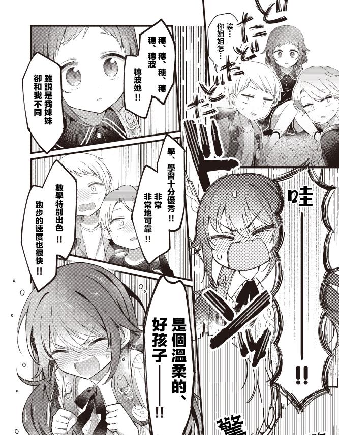 动画第四集、动画第六集等我们都看到了妹妹穗波的可靠之处,对于性格迷糊、胆怯,在外人看起来像个另类的海果来说,一向冷静处事的妹妹是海果很好的依靠。Manga Time Kirara 2023年12月号封面(独立创刊20周年纪念号)是星灵感应,其中内容更新了一篇穗波和海果的故事。以妹妹视角,得知妹妹的冷静与过去的经历相关。