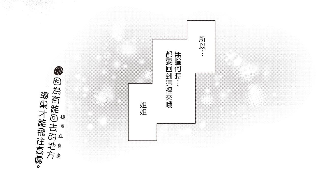 两人互相信任、依靠和支持,诚如尾页的那一句:“因为有可以回去的地方,海果才能飞往高处。”因为有穗波的存在,海果才能走得更远;也因为有穗波的存在,海果才没迷失。