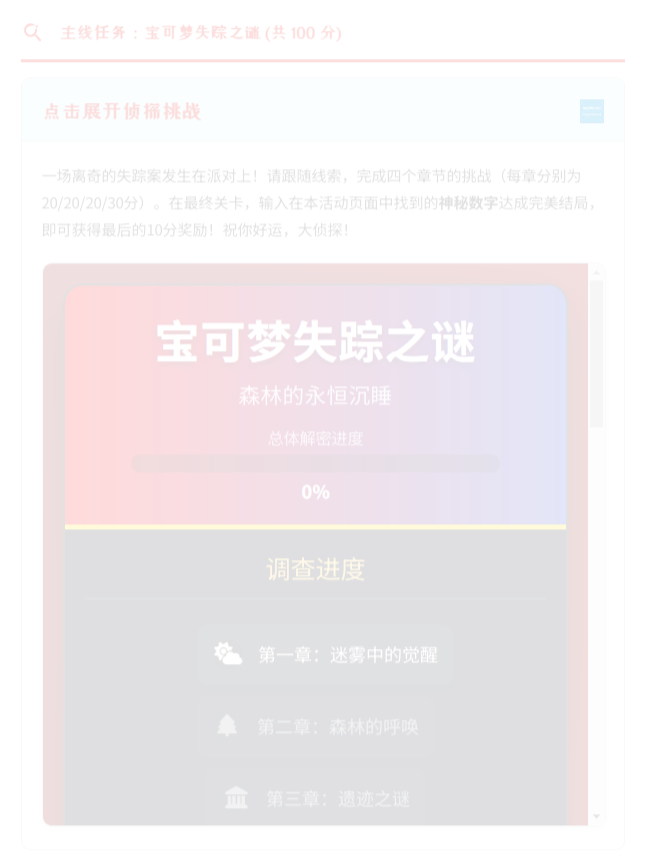 一场离奇的失踪案发生在派对上!请跟随线索,完成四个章节的挑战(每章分别为20/20/20/30分)。在最终关卡,输入在本活动页面中找到的神秘数字达成完美结局,即可获得最后的10分奖励!祝你好运,大侦探!