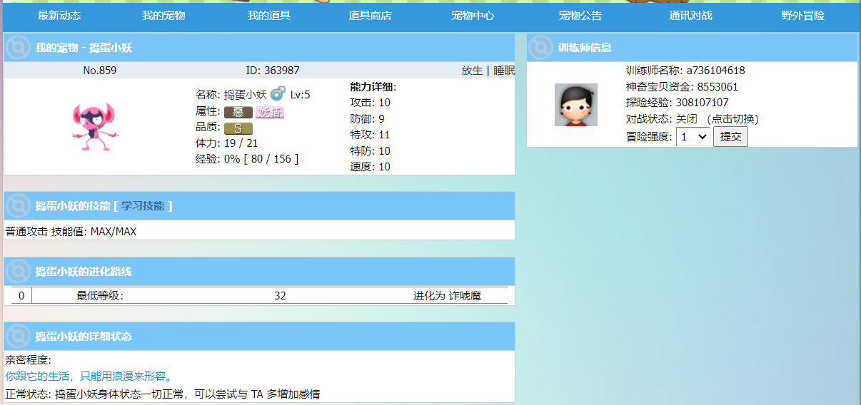 11. 组别(进化型序号)及宠物名:(000#—000#)组:宠物1-宠物2