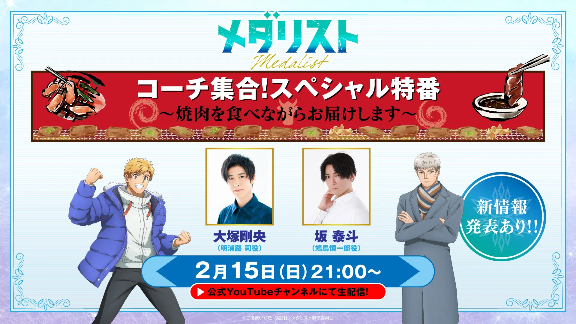 官方决定于2月15日(周日)播出名为“《金牌得主》齐聚一堂!特别节目——边吃烤肉边播报”的YouTube特别节目,届时饰演明浦路司的大冢刚央和饰演鴗鸟慎一郎的坂泰斗将亲临现场。正如动画作品当中的烤肉场景一样,两人将一边享用烤肉,一边探讨动画作品的魅力,并分享一些新的幕后故事!