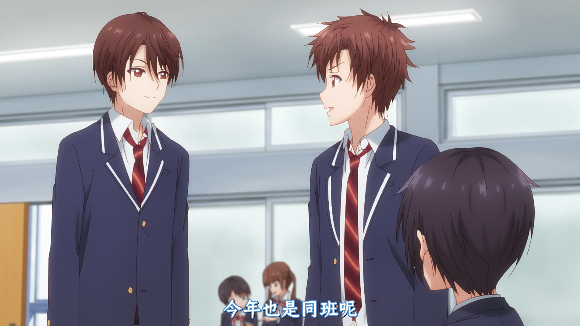 于是第一幕——“新学期的重新分班,在学校形同陌路却在家不停腻歪的小两口”开始,书接上回,新学期到来,自然是校园番的重新分班套路,真昼如愿和藤宫分在一班(藤宫内心估计也是这么希望的),基友小两口也是在一块哦