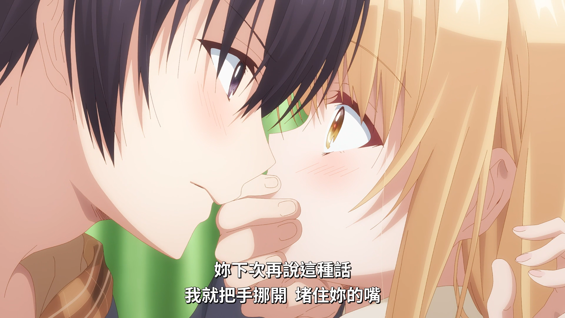 藤宫被这些话弄得害羞,这回大胆地做出一个“强吻”的动作,用头贴上真昼的脸,中间用手隔开,“警告”真昼说:你再这样说我就“堵住”你的嘴。