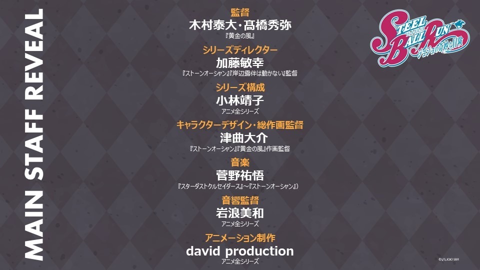 《JOJO 的奇妙冒險 飆馬野郎》將交由木村泰大以及高橋秀彌執導、加藤敏幸負責系列監督、小林靖子為系列企劃、津曲大介負責角色設計與總作畫監督、菅野祐悟負責音樂、岩浪美和擔任音樂監督,動畫製作則是同樣由 david production 負責。
