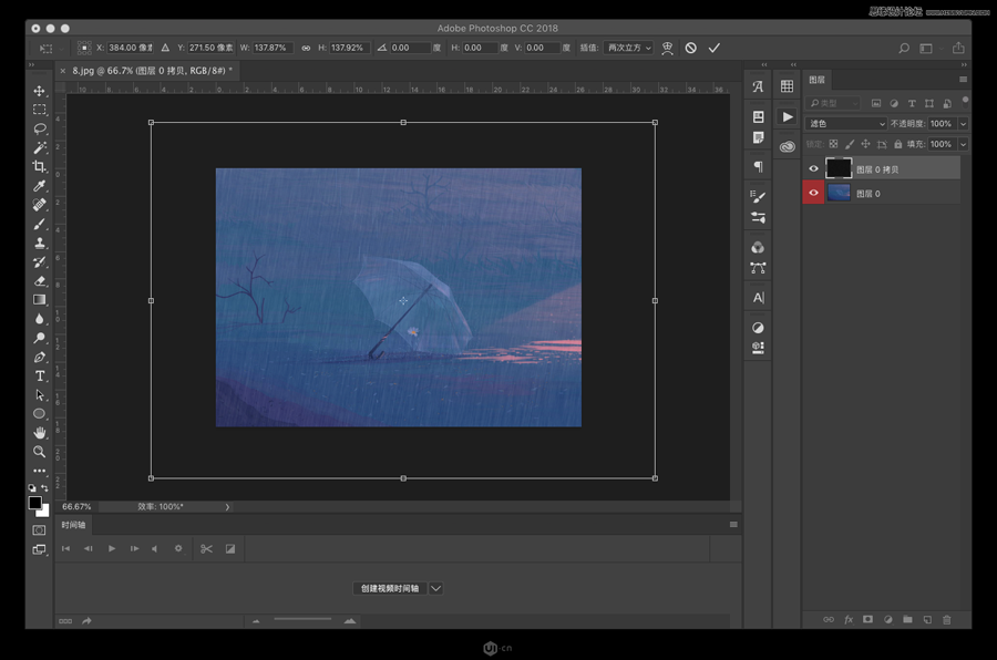完成以后图层会变透明,形成下雨的效果,但是边缘的颜色会有些深,我们可以把图层放大一些ctrl+t
