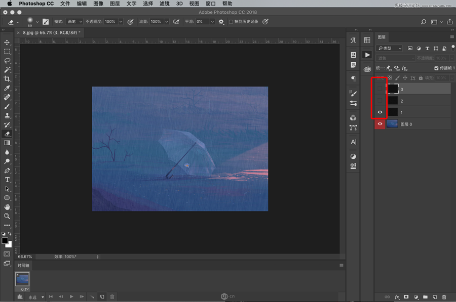 然后我们会发现出现了第一帧,将时间设置为0.1s,将图层只保留第一个