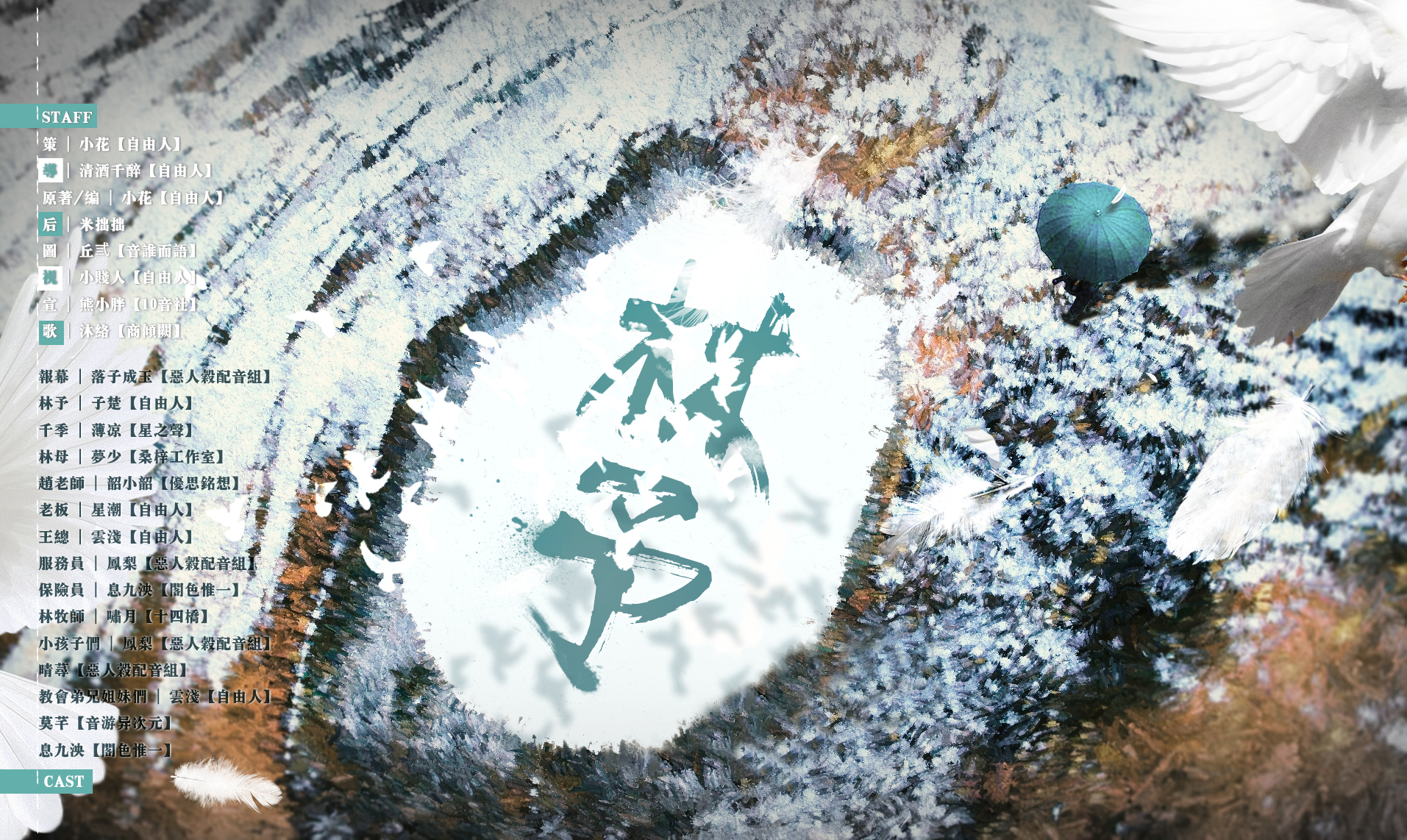 ![]() Staff: 策划:小花【自由人】 导演:清酒千醉【自由人】 原著/编剧:小花【自由人】 后期:米拙拙 美工:丘弎【音谁而语】 视频:小贱人【自由人】 码宣:熊小胖【10音社】 歌唱:沐络【商倾阙】 Cast: 报幕:落子成玉【恶人谷配音组】 林予:子楚【自由人】 千季:薄凉【星之声】 林母:梦少【桑梓工作室】 赵老师:韶小韶【优思铭想】 老板:星潮【自由人】 王总:云浅【自由人】 服务员:凤梨【恶人谷配音组】 保险员:息九泱【阁色惟一】 林牧师:啸月【十四桥】 小孩子们:凤梨【恶人谷配音组】 晴荨【恶人谷配音组】 教会弟兄姐妹们:云浅【自由人】 莫芊【音游异次元】 息九泱【阁色惟一】 Ed: 《光》 原曲:《如果你也想起我》 原唱:林允儿 策划:小花【自由人】 填词:花津酒【Always 】 翻唱:沐络【商倾阙】 歌后:大梦【墨璃轩】 美工:姬魃【施予印工作室】 歌词: Stars in the sky 追逐清晨的一缕光 留存见你时模样 唇齿重复你名字 会溢满欢喜 在某处相遇借口天意 思念会沉积 让人心绪不宁 You are my star 原来你 最好的回应 融入你 生活的轨迹 会一直在一起 要永久眷恋着你 每一个梦都会消散 在醒来时候你的眸里 一生的承诺 我不再忘记 温柔的歌声 拂过有一些胆怯的心 在每个清晨 不断给我勇气 You are my star 原来你 最好的回应 融入你 生活的轨迹 成为你一道光 有童真祝福话语 有天上星光的沐浴 雪在零点时刻很美丽 清晨时的你 睡梦中的你 最后成为 牵我手的你 岁月多长 我陪你到底 心口你的名字 都是欢喜 那个清晨 刚好遇见你 以后每一个季节 给予你温暖陪伴