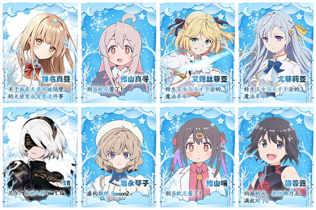 椎名真昼@关于我在无意间被隔壁的天使变成废柴这件事 绪山真寻@别当欧尼酱了! 艾妮丝菲亚·温·帕雷提亚@转生王女与天才千金的魔法革命 尤菲莉亚·玛赞塔@转生王女与天才千金的魔法革命 2B@尼尔:自动人形 Ver1.1a 岩永琴子@虚构推理 Season2 绪山哨@别当欧尼酱了! 梅普露@怕痛的我,把防御力点满就对了2