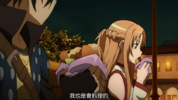 正在吃快餐的角色:桐人、亞絲娜