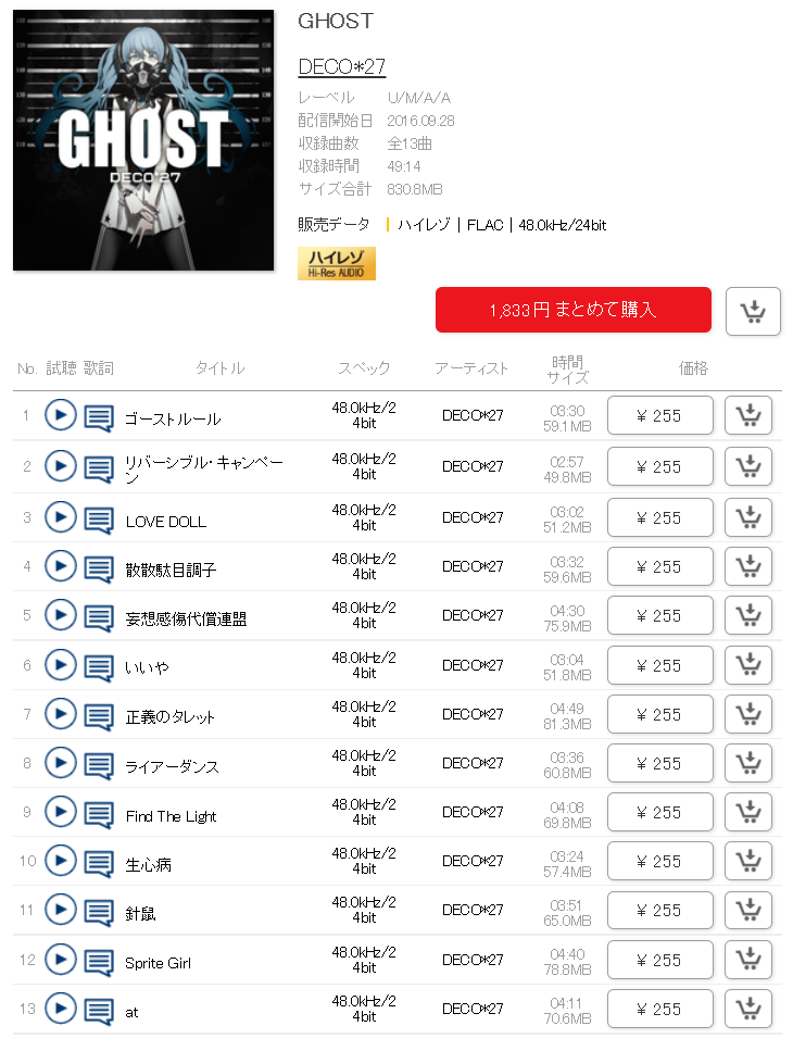 [音乐] [天翼/OD][Hires][160928]DECO*27 - GHOST [FLAC][48khz/24bit][647M] |