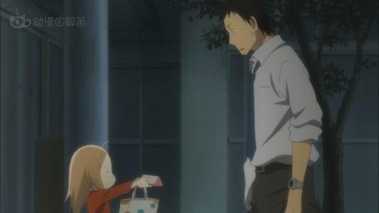 3、两人互动场景:大吉由于工作繁忙没能遵守早点接凛回家的约定(大吉上班前与凛拉钩约定),大吉为了表示自己的抱歉之意接受惩罚当场吞下了“千根针”(凛递过来的折纸牛蒡丝?)
