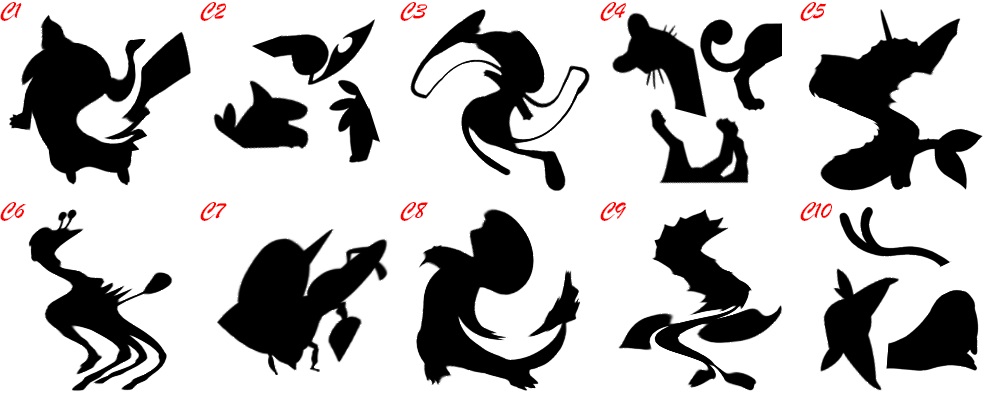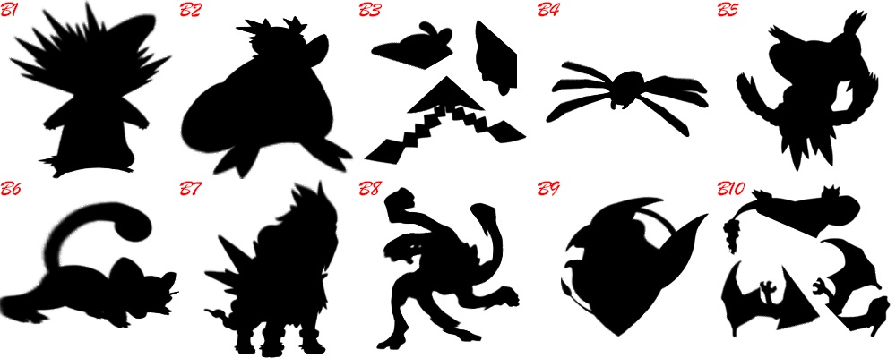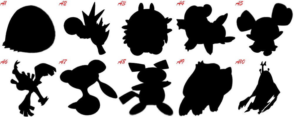 观察经过图像处理(翻转、旋转、拉伸、扭曲、撕裂等方式)后的宝可梦剪影,写出剪影对应的宝可梦(形如1#妙蛙种子)(原图全部来自于>神奇宝贝百科<第一、二世代宝可梦官方绘图)