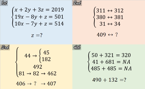 找出每组3个表达式的共同规律(其中有1组三元一次方程组,其他3组的数字均代表全国图鉴ID),写出最后1个表达式中?代表的宝可梦(形如1#妙蛙种子)以及规律。