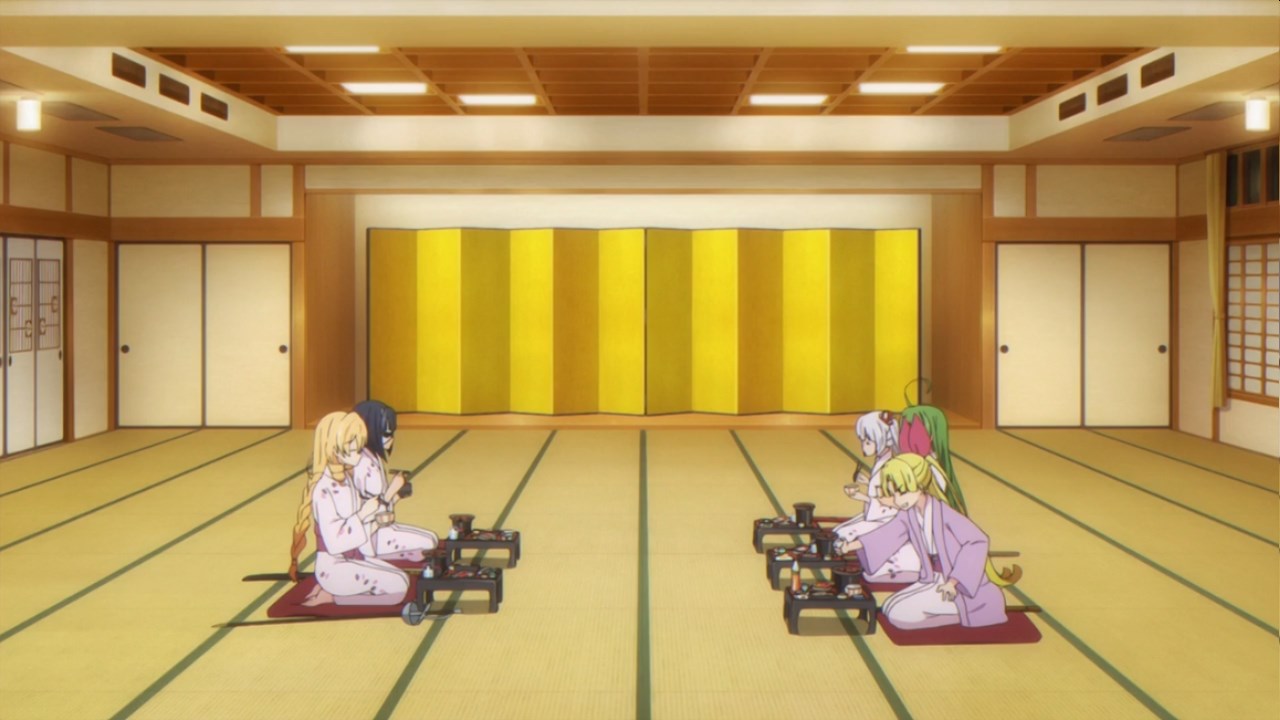 温泉旅馆中聚会之人:天真·珈百璃·怀特,月乃濑·薇奈特·艾普莉尔,胡桃泽·萨塔妮亚·麦克威尔,白羽·菈菲尔·恩兹沃斯