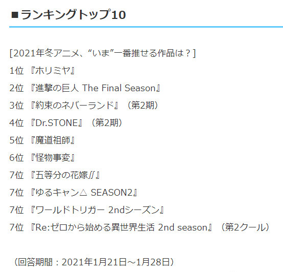 日本网站Anime.jp 2021年最值得推荐的冬季动画投票 TOP20!你最想推荐的是哪一部呢?