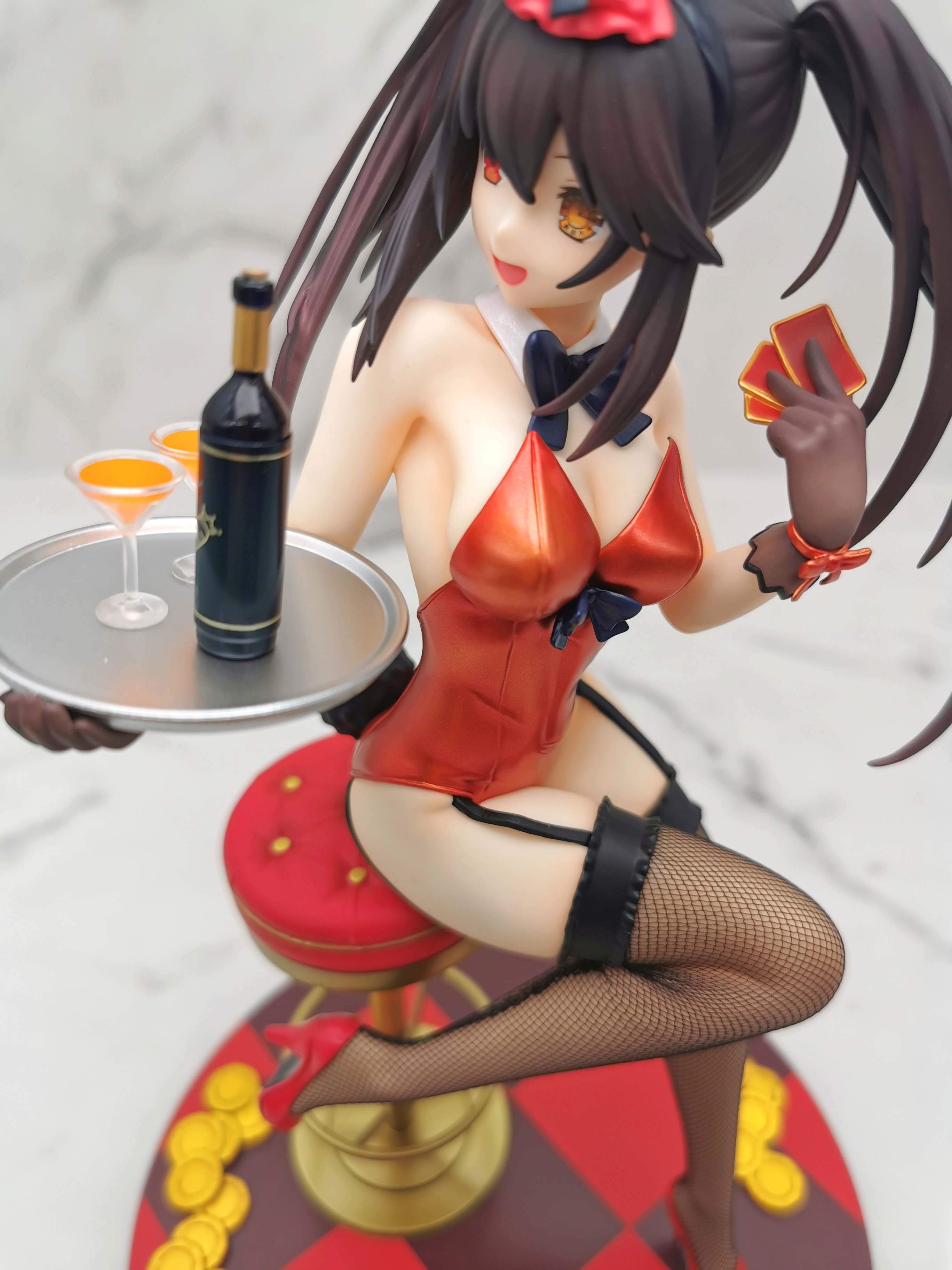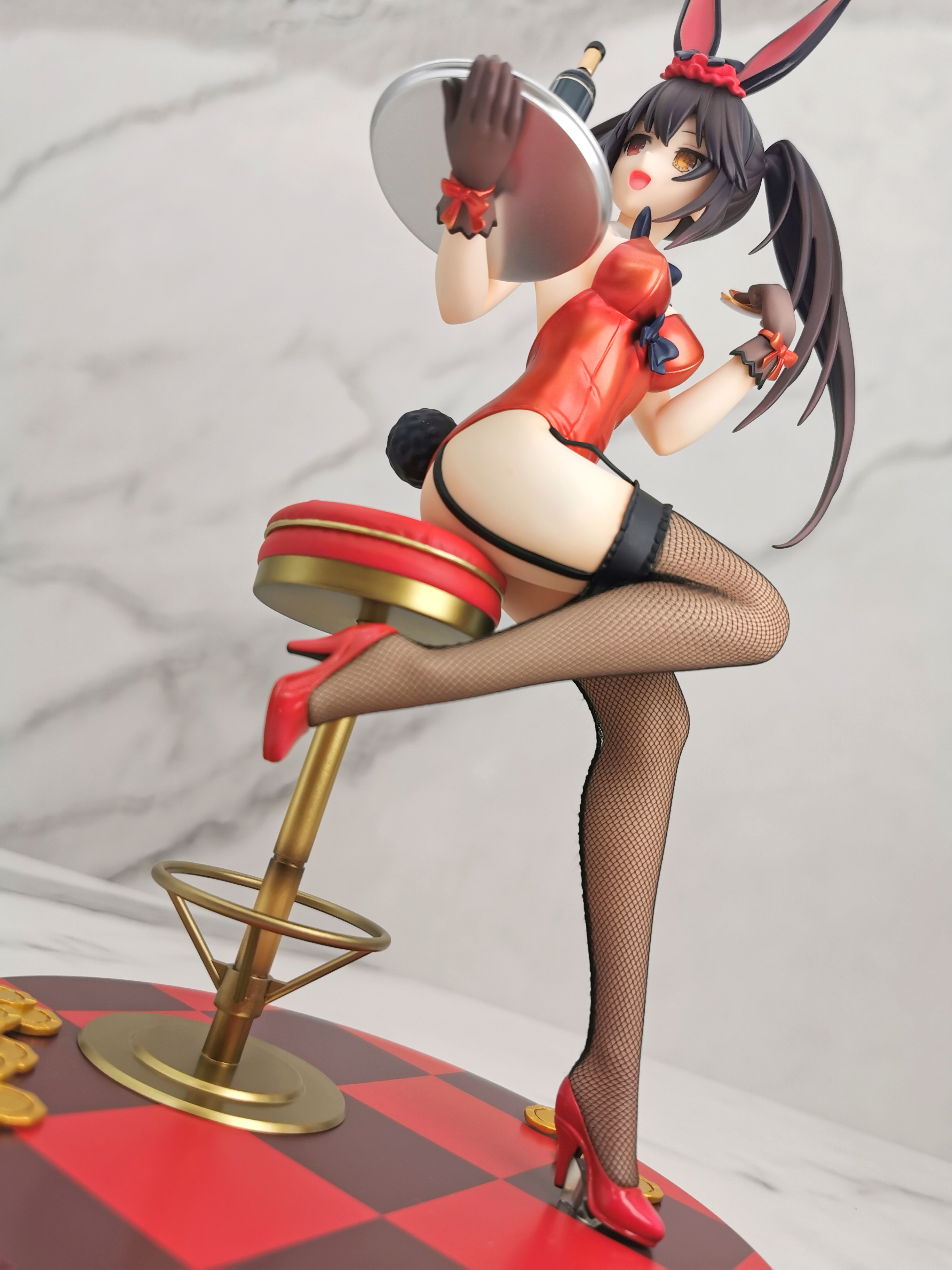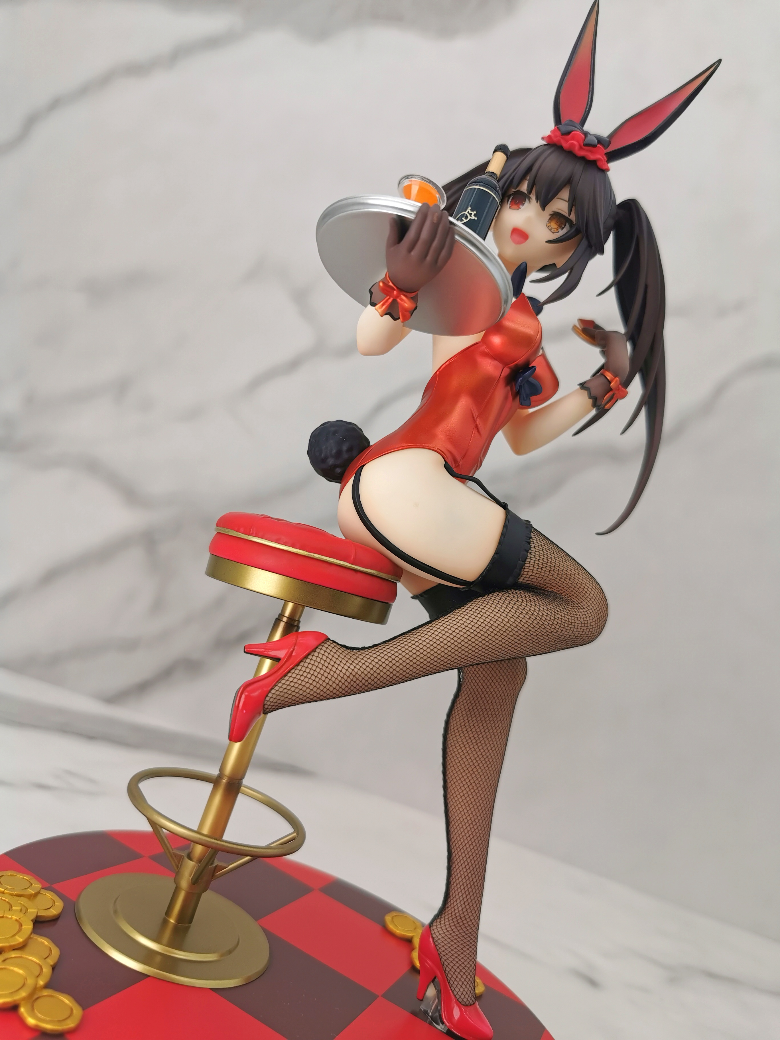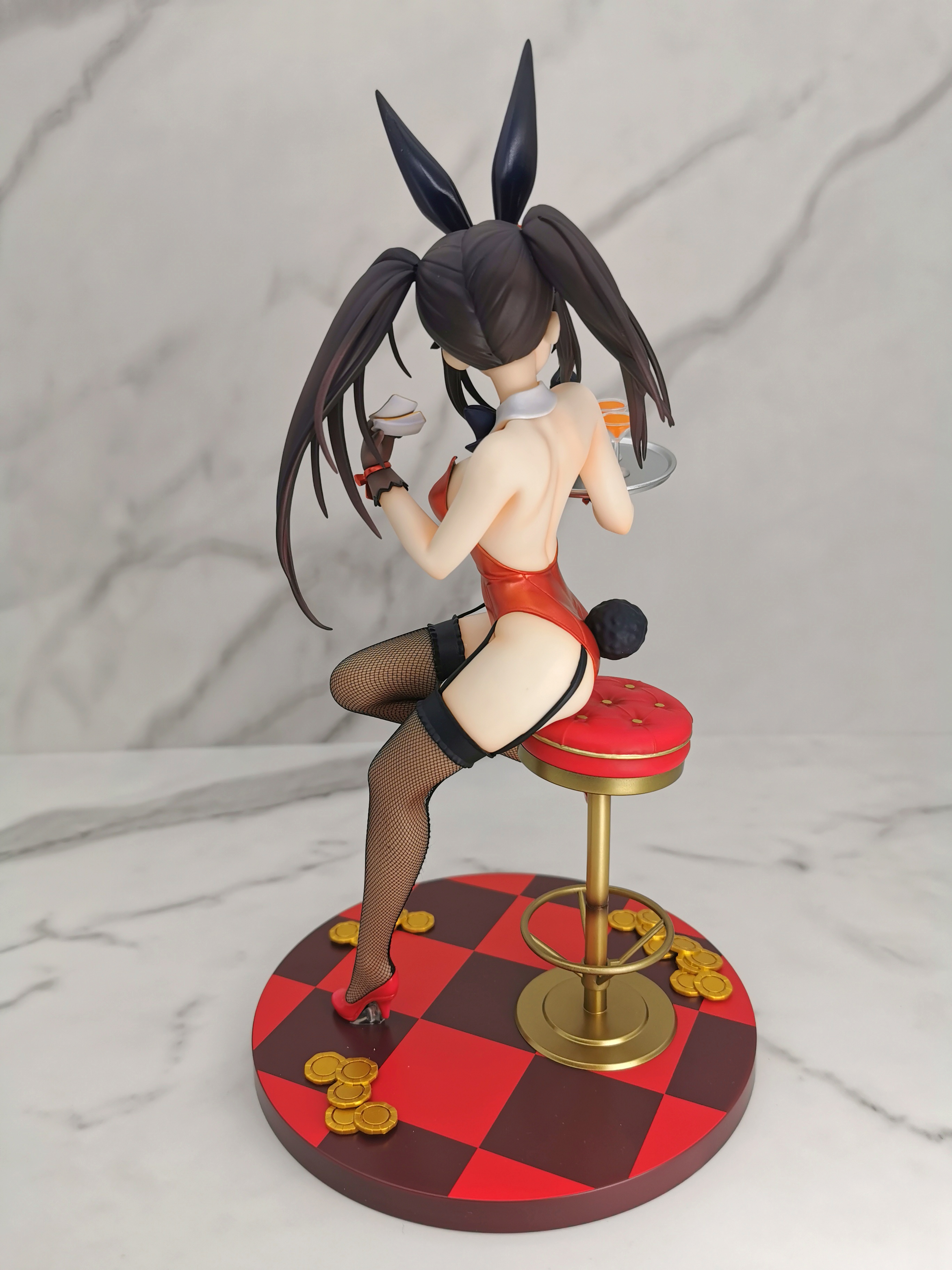 原图狂三是坐在赌桌的旁边,手办改为坐在了一个高脚椅上