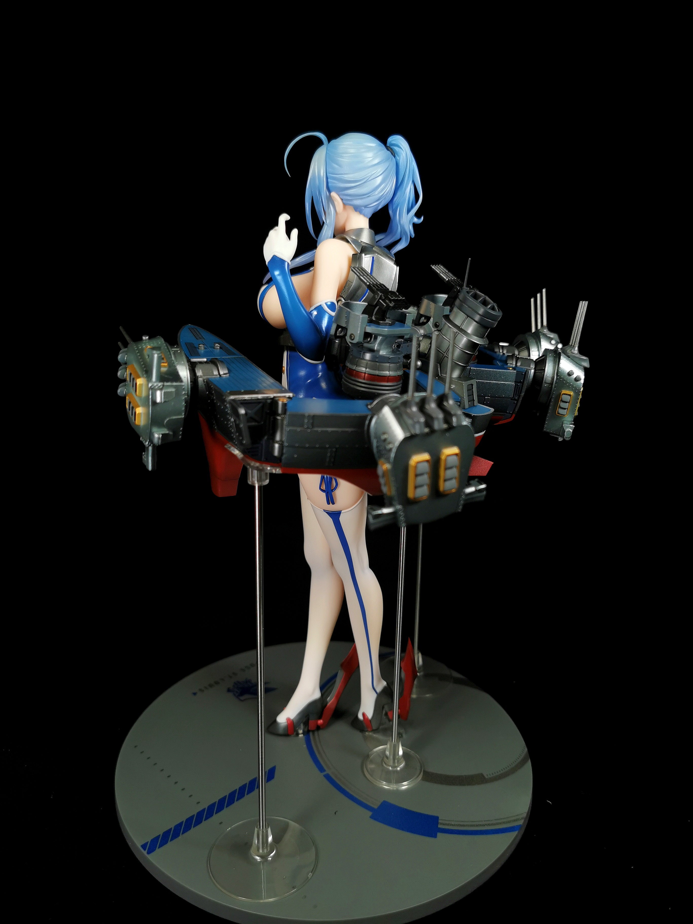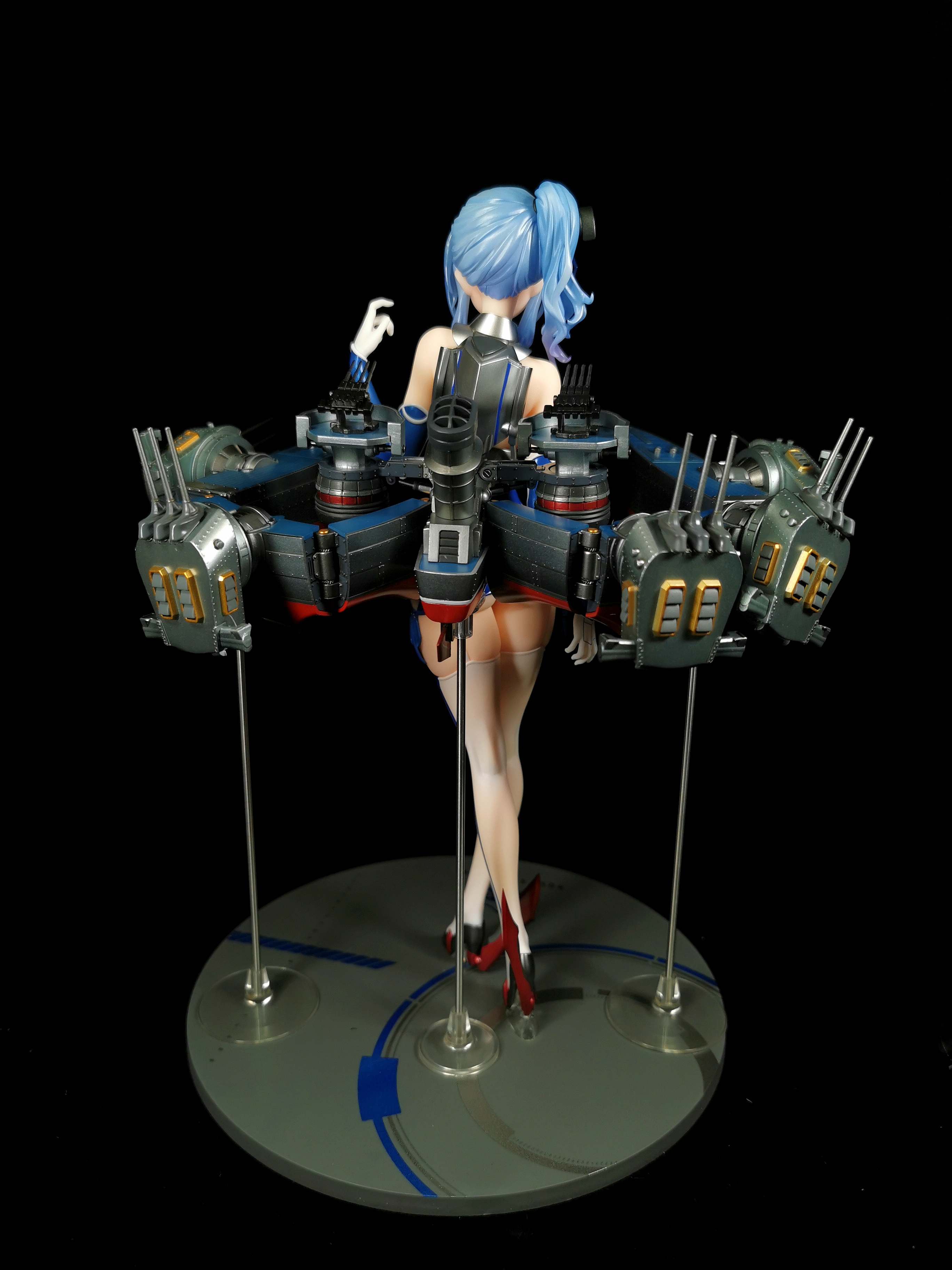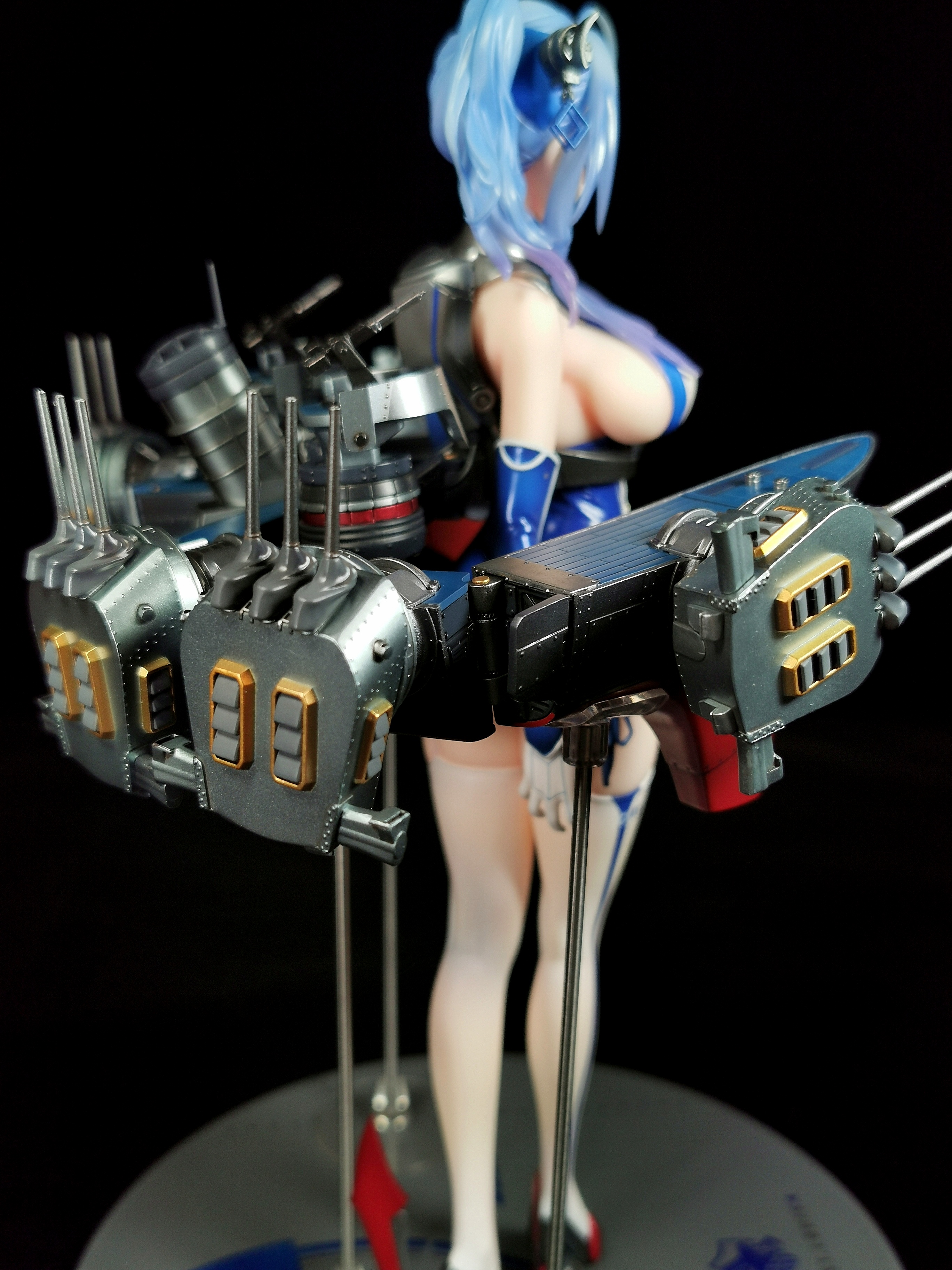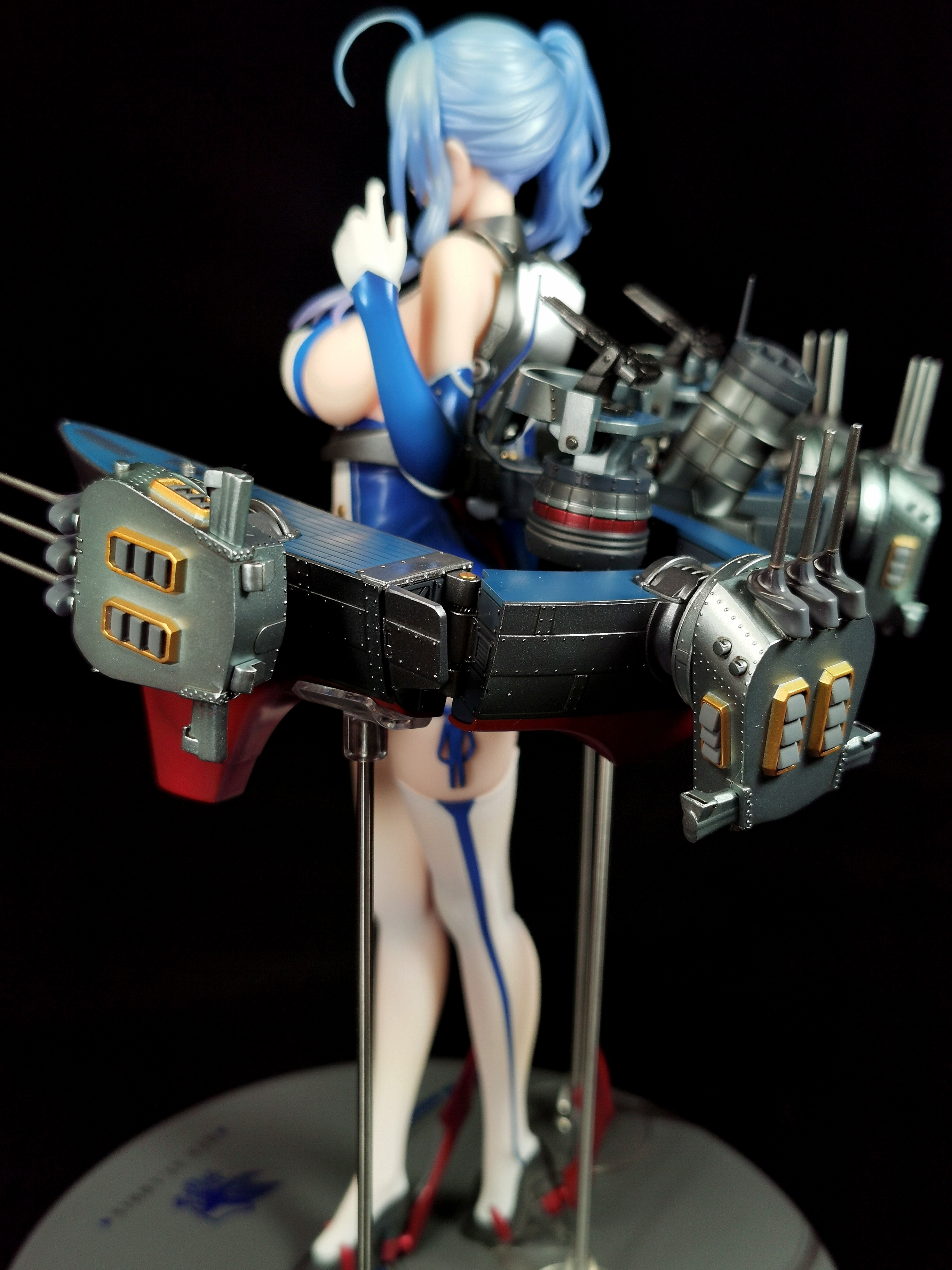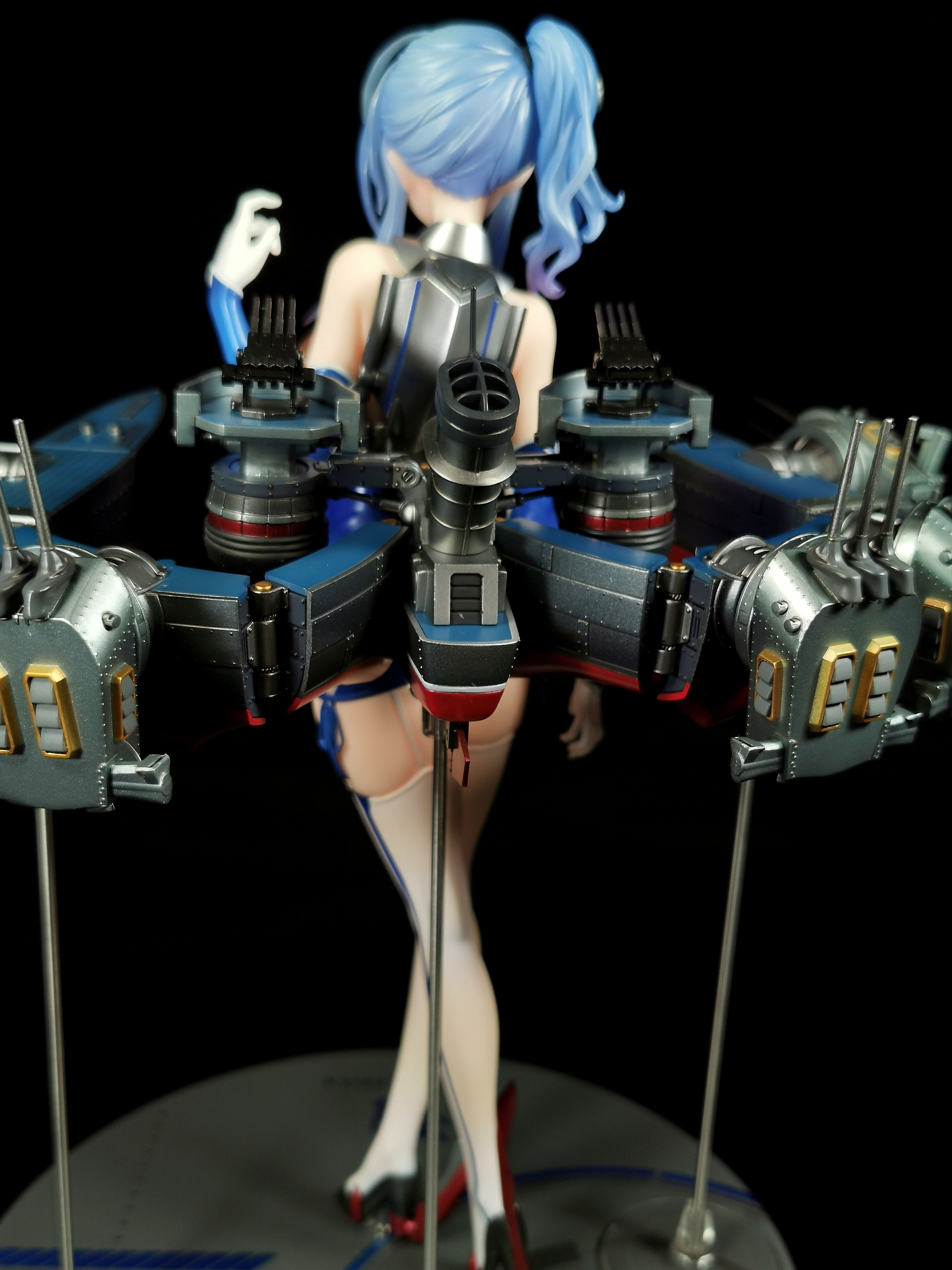 支撑是有三根金属柱垫在舰装下方三个位置,但金属柱与底座并未链接,而是有额外的底座放置在了手办的底座上