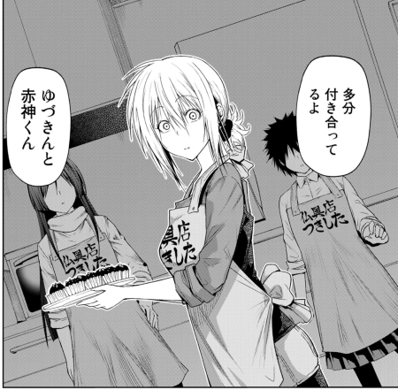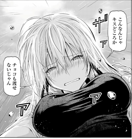 月夜在气氛的烘托之下,也是直接接受了海月的情人节巧克力&kiss大作战(具体请看漫画第66话),结果回想起来才意识到这好像有些离谱了(然而月夜不都亲过赤神了吗,有什么离谱的x),不过,在两位好闺蜜真奈和有纪的推动下,月夜最终还是决定要做巧克力(不过一开始说的是义理巧克力)。