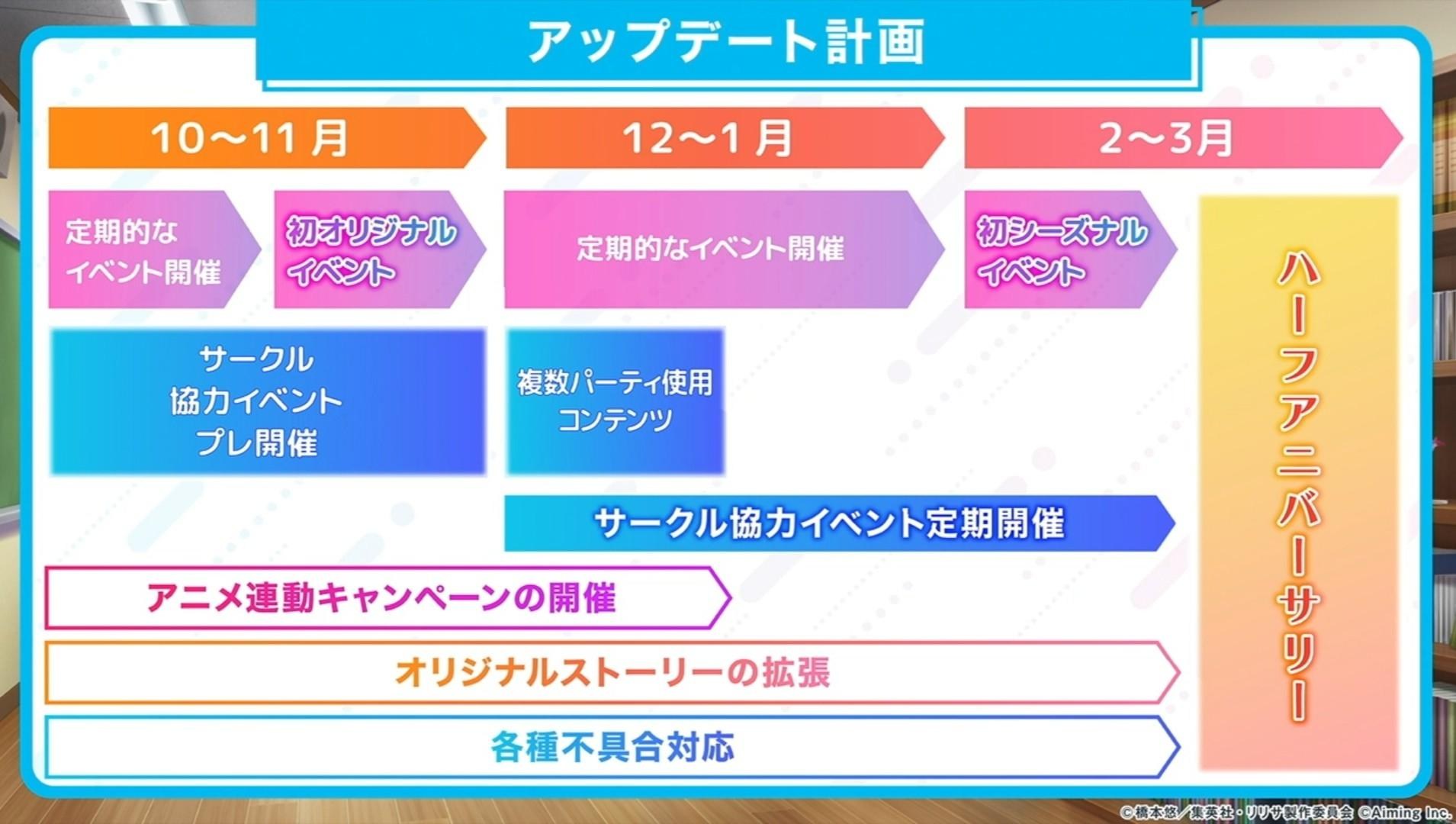 此外,官方率先公開未來半年的遊戲更新計畫,分別為 10 月~2025 年 1 月定期舉辦活動、11 月實施首個原創活動、10 月~ 12 月實施動畫連動活動、12 月推出可使用複數隊伍的遊戲內容、2025 年 2 月實施首個季節性原創活動、2025 年 3 月迎來遊戲半週年,此外亦會定期舉辦社團協力活動、原創故事更新 以及各種故障改修。