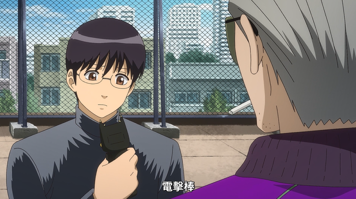 服部离开之后,下一个来到天台上的是松平老爹,而松平老爹送给新八叽的饯别礼,是一个电击棒……