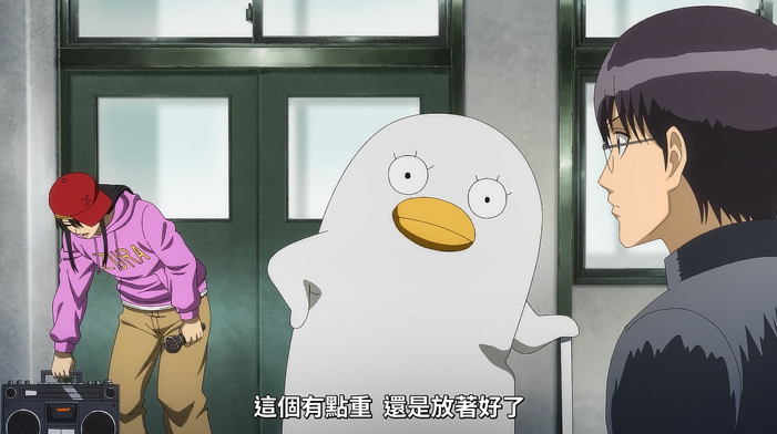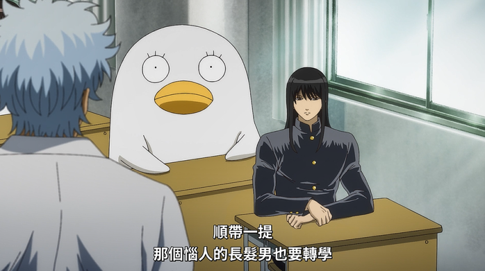在讲完了新八叽和阿妙要转学的事情之后,银八还不忘提一下假发,顺便还问了假发什么时候会退学