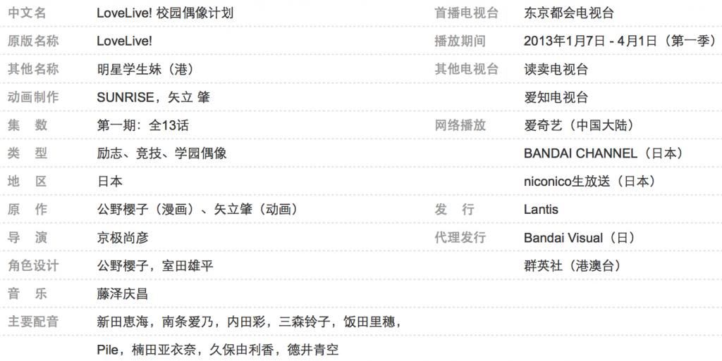 《Love Live!(ラブライブ)》是由日本知名动画制作公司SUNRISE、音乐出版商Lantis、以及 ACG 月刊杂志电击 G's magazine联手打造的2次元偶像计划。2012年2月19日宣布动画化。2013年1月6日播放TV动画(全13话)第一季,2013年3月31日完结。2014年4月6日播出第二季。