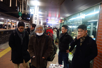 博多までやってきたが鉄道も1時間以上の遅れ。ホームで寒さに震える取材スタッフ一同。