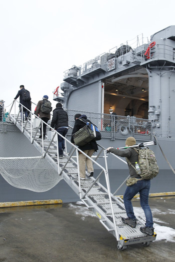 護衛艦「くらま」の雄姿と取材スタッフたち。。1981年に就役した「くらま」は対潜ヘリの母艦機能を強化した「しらね」型ヘリコプター搭載護衛艦の2番艦。旗艦機能を持ち、長く護衛艦部隊の中心的存在として活躍した。近い将来、退役する予定だ。