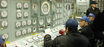 蒸気タービン機関を制御する機関操縦室。最近の艦ではデジタル化が進み、計器類はモニター表示になっているが、80年代生まれの「くらま」にはアナログな計器類が並んでいる。