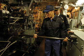 機関員が“棒”を耳に当てている。これは「聴診棒」と呼ばれるもので、タービン内のギアの音を聞いている。音で機関の不調を察知するのだ。