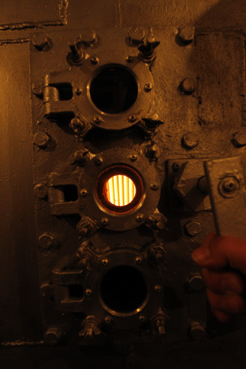 小窓からボイラー内で赤々と燃える炎が見える。ここから火加減をチェックするそうだ。