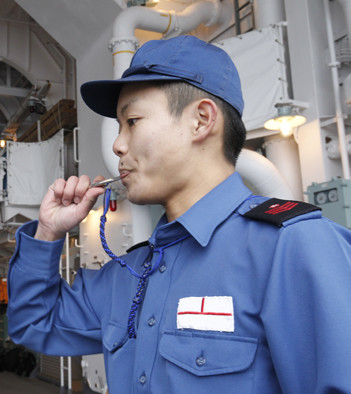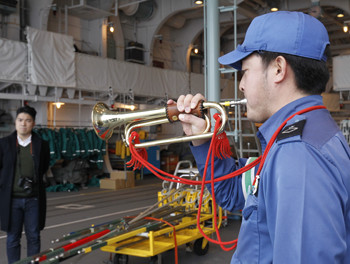 「サイドパイプ(号笛)」と呼ばれる笛は日本海軍時代から使われているもので、さまざまな呼出や合図、号令に使われる(発祥はイギリス海軍と言われている)。