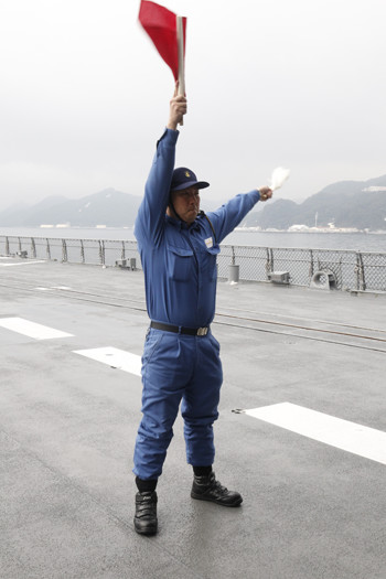 ※「す・み・ま・せ・ん」の手旗信号。第1話で集合時間遅れてしまった「晴風」から教官艦に向けて送られた手旗信号もここで取材されている。この他にも艦内のすみずみを回り「くらま」の音を収録した今回の取材。アニメのなかで何気なく聞こえてくる音は「くらま」で収録されたものかも?