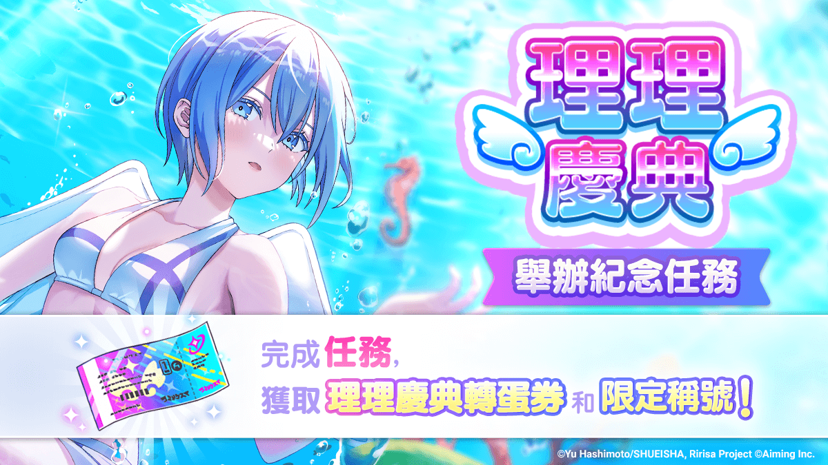为纪念理理庆典转蛋角色【守护大海的苍穹】诺基艾露(泳装)诺诺亚 登场,决定实施理理庆典举办纪念任务,期限内完成任务可获得提升数值限定称号「【守护大海的苍穹】诺基艾露(泳装)诺诺亚」与理理庆典转蛋券。