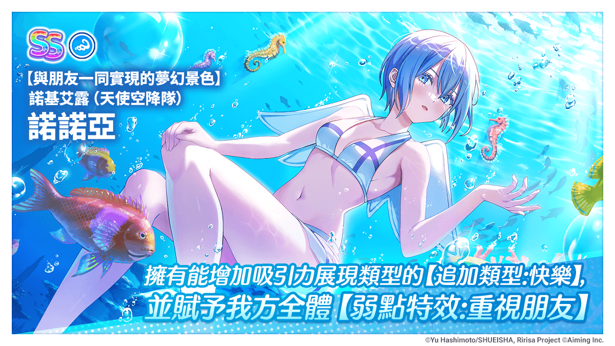 由 Aiming 制作、台湾由 大宇资讯 担任繁中版营运及宣传,电视动画《2.5次元的诱惑》延伸智能型手机游戏《2.5 次元的诱惑 天使们的舞台》,官方在 30 日这天推出理理庆典转蛋【守护大海的苍穹】诺基艾露(泳装)诺诺亚。