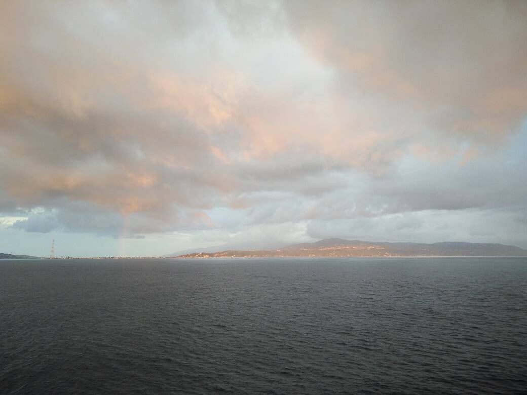 补一张我从马耳他出来后前往墨西拿(西西里岛)的黄昏海景图,这会刚出港口,我就看见天上出了道彩虹,配上昏黄的天色,老美了。