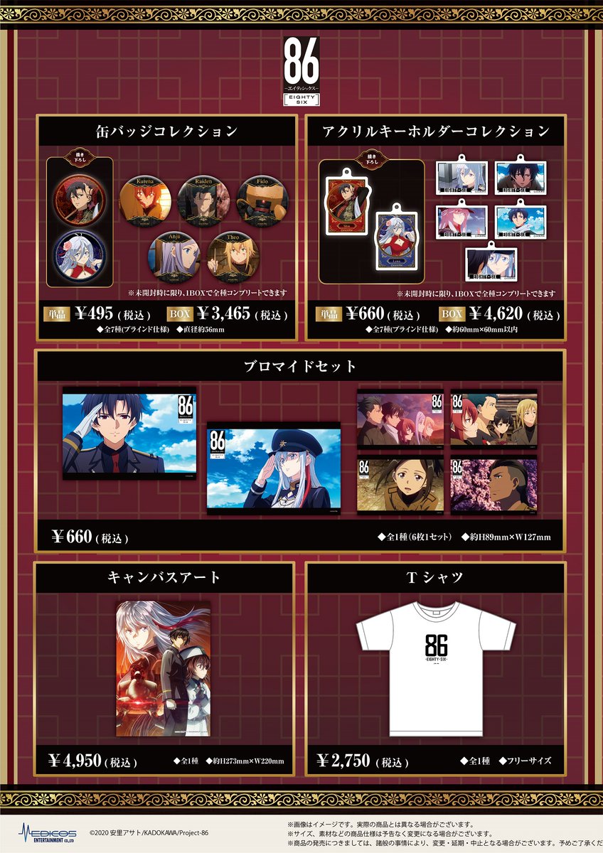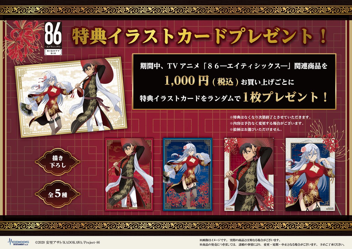作為消費特典,購買電視動畫《86-不存在的戰區-》相關商品滿額 1000 日圓(含稅)可隨機獲得「特典插圖卡 1 張(全 5 種)」,同時於會場滿額 5000 日圓(含稅)並填妥抽獎券即可參與抽選獲得活動會場所展示的「等身大看板(全 2 種,事前填寫)」。