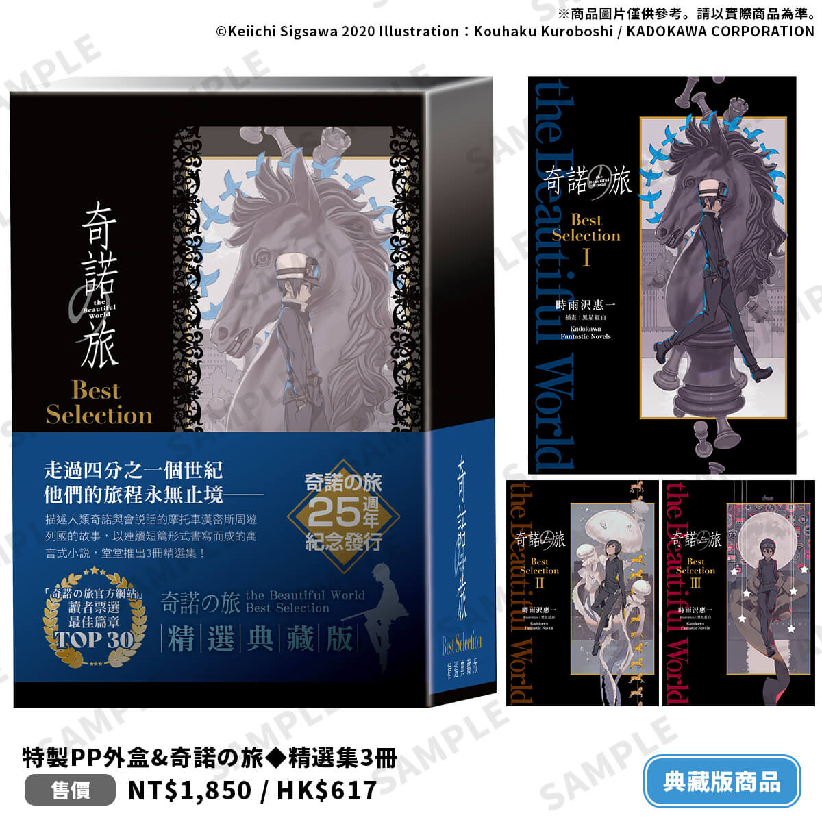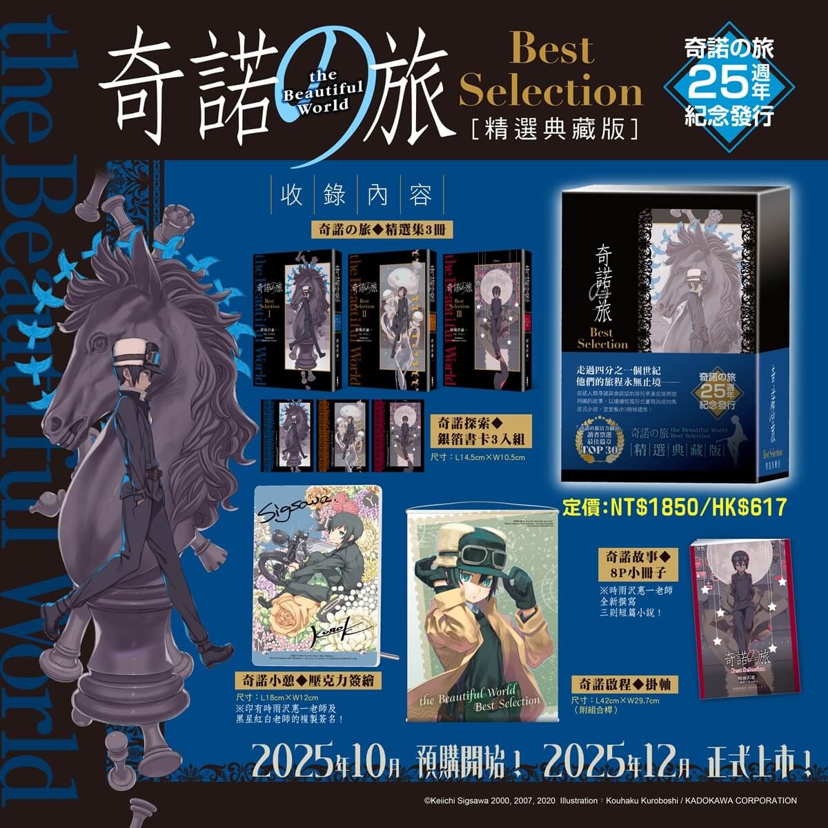自 2000 年连载以来,以独特寓言笔法描绘旅人与世界交错故事的《奇诺之旅(台湾角川译名:奇诺の旅)》,堂堂迈入二十五年旅程。 为了让尚未踏上旅途的新读者能轻松入门,同时让老读者再度回味这部名作,编辑团队于日本「奇诺の旅」官方网站举办了 20 周年特别投票企划「投票之国」,共有超过 17,790 张投票选出最受欢迎的 TOP30 篇章。 除了人气篇章外,作者时雨沢惠一与插画家黑星红白也各自挑选出个人最爱故事,并由时雨沢老师亲自决定收录顺序,打造出真正意义上的「奇诺の旅 Best Episode Collection」。 此外,书中亦收录全新撰写短篇与作者特别后记,让新读者与长年追随奇诺的粉丝,都能再次体验这段寓言旅程的精髓。 为纪念这段跨越时光的经典系列,台湾角川推出 25 周年纪念发行《奇诺之旅 the Beautiful World Best Selection【精选典藏版】》,并于即日起开放事前预购。