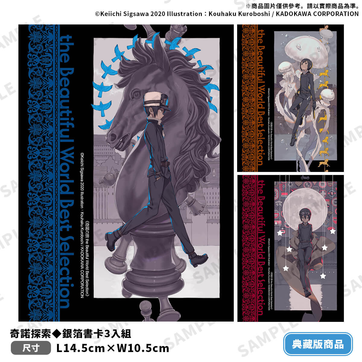 由插画家黑星红白绘制插图的《奇诺之旅 the Beautiful World Best Selection【精选典藏版】》,以「奇诺」的旅程为核心概念设计整体装帧,三册分别描绘象征思考与行动的意象物来作构图,重现旅人对世界的凝视。 典藏版内容收录由读者投票选出的 TOP30 篇章,搭配「奇诺启程◆挂轴」、印有时雨沢惠一老师及黑星红白老师的复制签名的「奇诺小憩◆压克力签绘」、「奇诺探索◆银箔书卡 3 入组」特典,并收录时雨沢惠一全新撰写三则的 8P 小册子。 整组以典雅 PP 收藏外盒包装,凝缩《奇诺の旅》二十五年间的轨迹与浪漫。 本次典藏版预购自即日起开放事前预购至 11/4(二)。