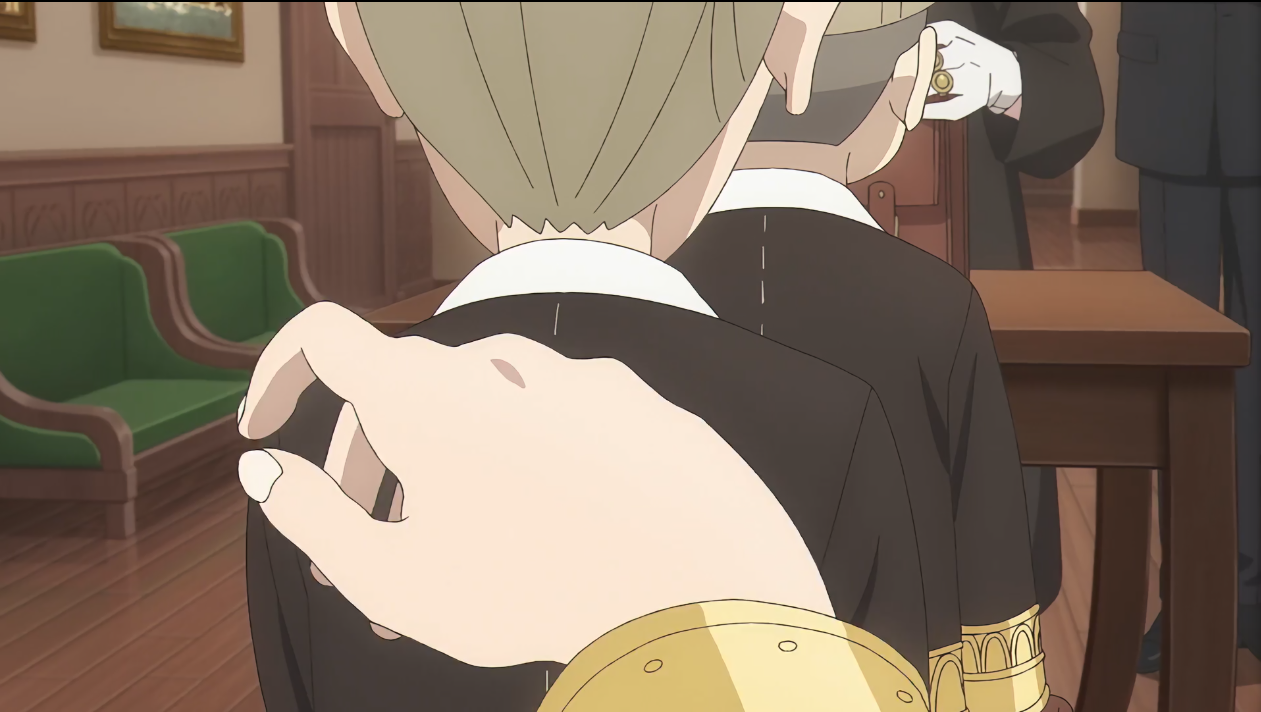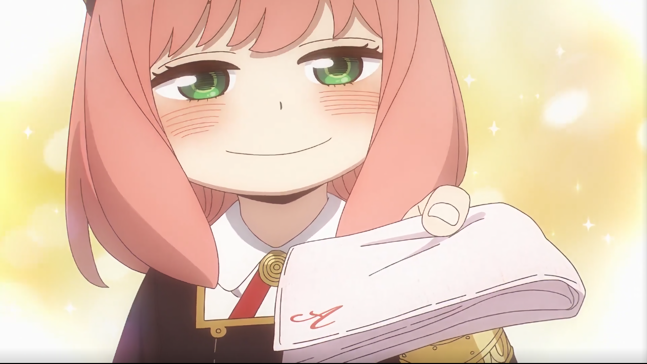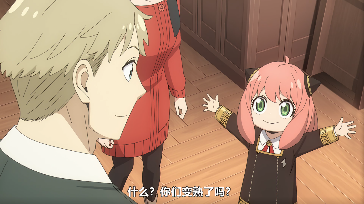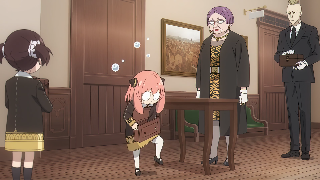 在劝谏学生们“打起精神”的时候,眼睛一直盯着阿尼亚,这使得阿尼亚在内心吐槽“为什么要看阿尼亚”(你自己心里没点数吗())。下课后,阿尼亚和贝姬收拾用具。在柜前,贝姬说昨天她太专注锻炼(锻炼?最开始我没反应过来,我这查错字的时候才反应过来,好家伙,你真的在练拳啊)导致自己差点忘记写作业了,阿尼亚对此表示自己的父亲是魔鬼因此不担心会出现忘记写作业这种事情。(恕我直言,你还记得你把你爸气的人快升天这件事吗())