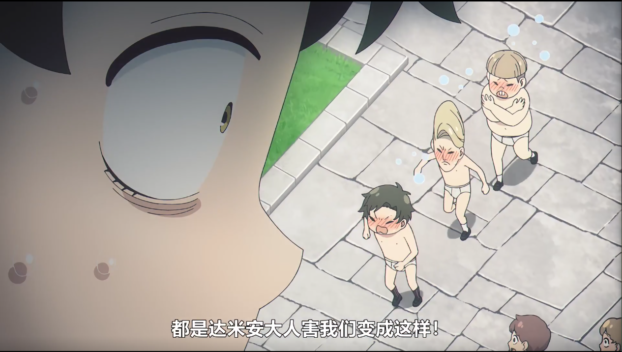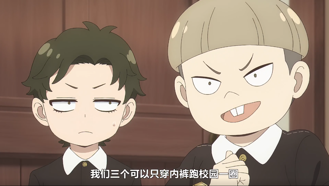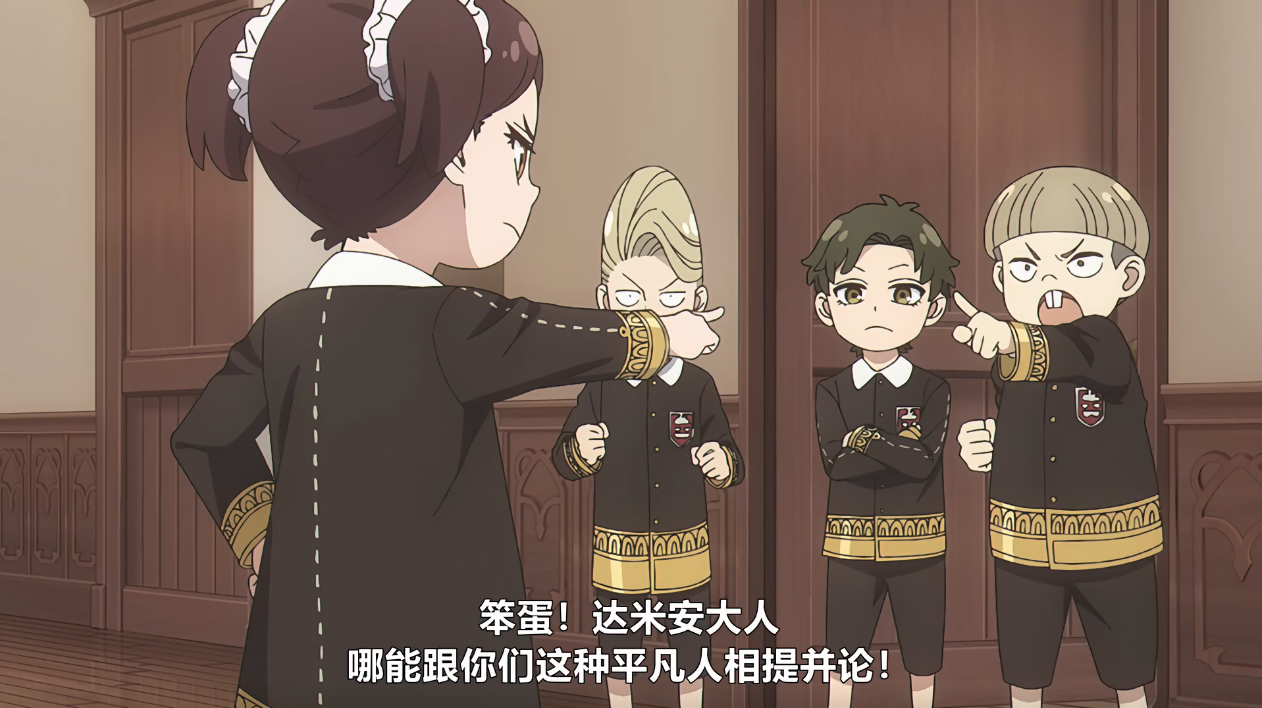贝姬表示居然这么好(闻到了桃色废料),此时镜头切换到不远处朝她们走来的达米安和俩跟班(怎么又是从低往高拍,并且近处有小腿的特写,监督你在干什么.jpg)表示阿尼亚迟到和打瞌睡明明是常态,一脸得意的表示自己都可以预言未来了,认为阿尼亚一定是年级里第一个集满八雷退学的学生。(看着吧,真走你又不乐意了())对此,让我们使用炎拳吧.jpg