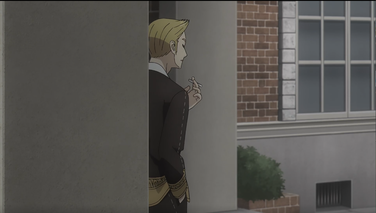 女性角色看向远处的男角色,此时可以发现这个男角色似乎打算吸烟。镜头拉到这个男角色,确实在吸烟(小孩子不要模仿哦,话说这个学院最高年级是几岁的学生来着,应该没成年吧)。
