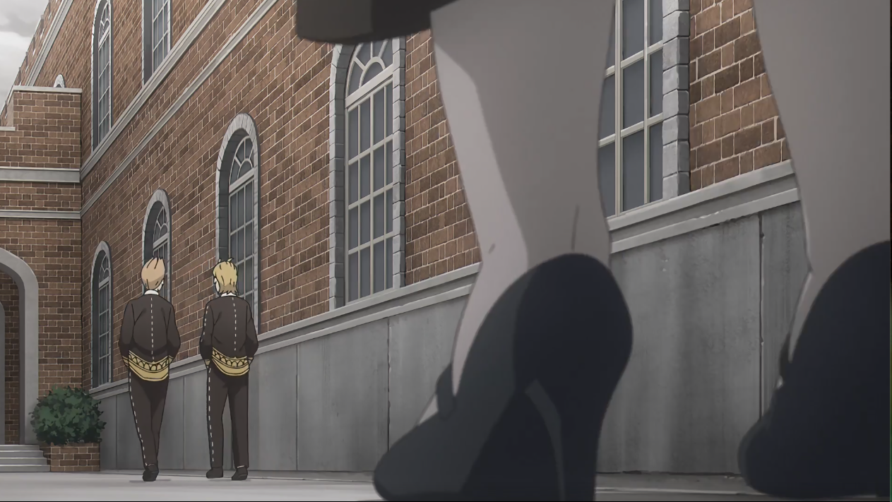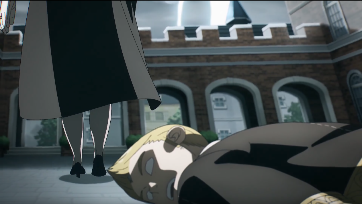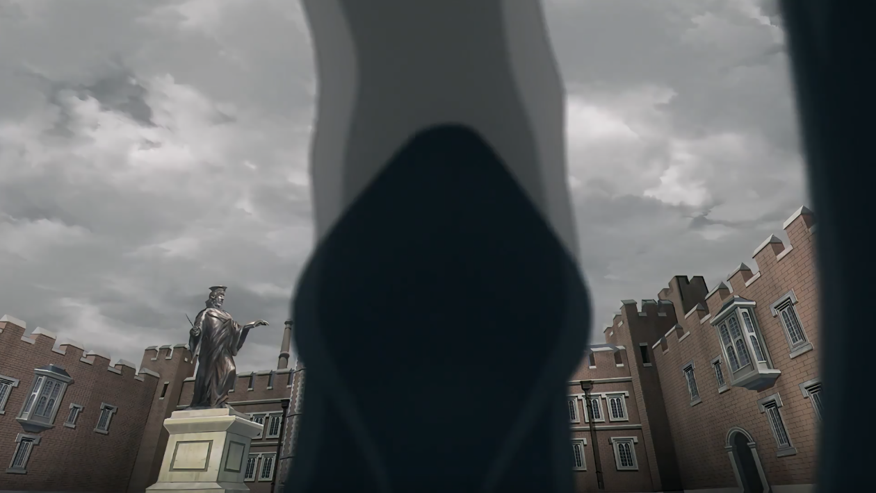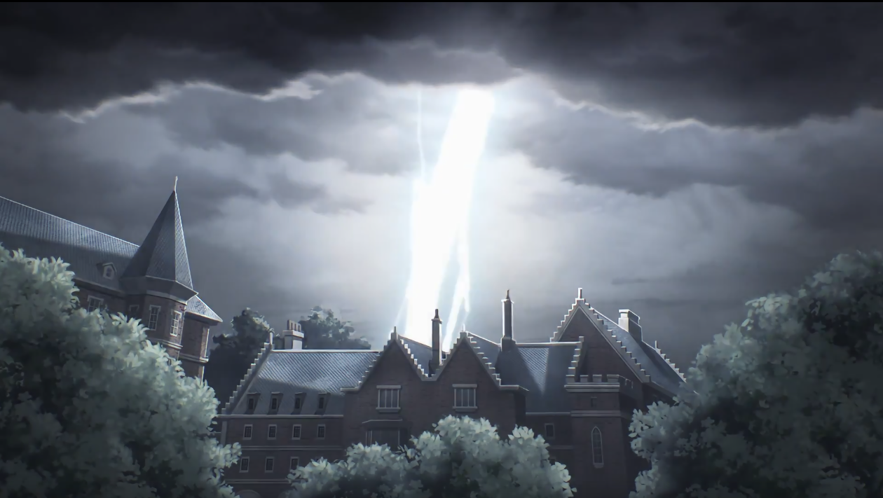 随后也是个特写——先展现学院的一景,并通过出现的鞋子再次体现角色的行进方向,此时的天空被乌云笼罩,云内隐藏雷闪,很明显的通过画面暗示接下来的剧情走向。