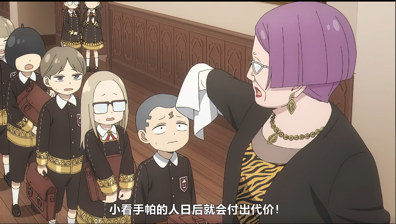 此时镜头切换到阿尼亚那边,大个开始介绍这位女老师的背景。在讲述这位病好复职的老师的过往时表示这位老师及其严厉,稍有不体立刻授雷,并有上百人的逼退“战绩”,人称“雷电大婶”(草,好俗气的俗称)。在他身边的学生们对此表示惊讶,大个此时依旧在劝众人赶紧逃(不是,我寻思学生能逃到哪里啊),说四班已经深受其害。话音未落,对方已然来到跟前,一脸杀气的她礼貌的做着自我介绍。