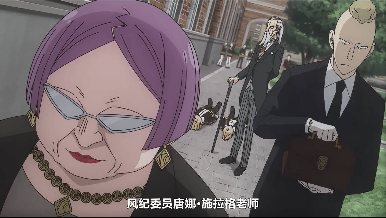 转瞬即逝,两位学生倒地。应该是教导主任的女性中二的来了句雷闪落,还摆了个poss。男随从附和着女主人,这时候优雅大师出来迎接这位女老师,双方寒暄片刻开始剑拔弩张。可以看出这位女老师此次前来可谓是杀气腾腾,此时这位女老师的身份正式公布:风纪委员唐娜·施拉格老师。