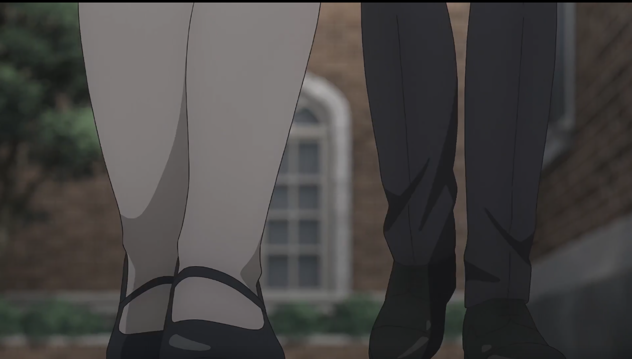 画面一开始就是一个非常规镜头:近景甚至是特写两位角色的小腿部,可以看出画面中的两人正在往镜头处行走,可以推导出左边的角色应该是女性,右边的角色应该是男性(通过鞋子推导出,一开始是这种镜头个人觉得比较少见)。