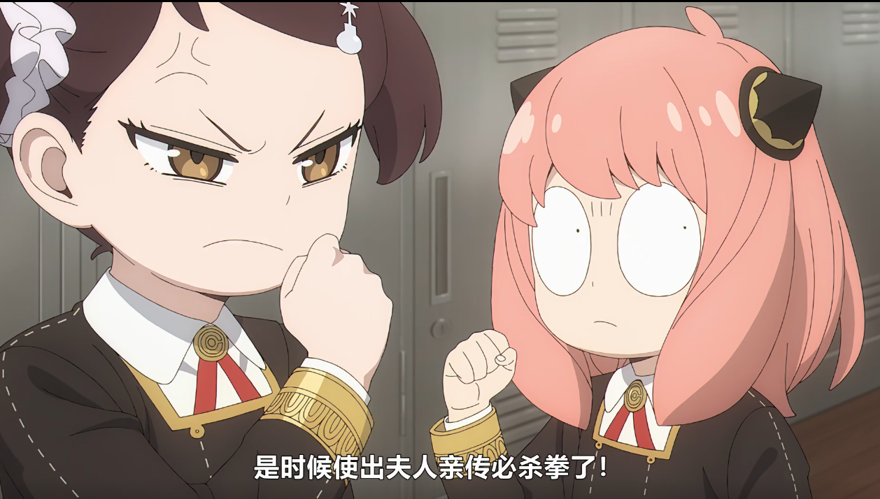 正当阿尼亚握紧拳头打算打过去的时候,画面拉远,贝姬进入了画面,并也握紧了拳头,喃喃表示是时候使出约尔亲传必杀拳了!(你确定学会了吗,那种威力以吨为单位的拳?加:看样子至少是真的在练。。。)